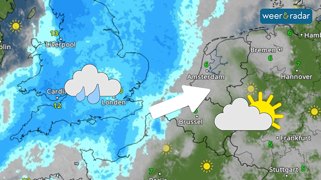 Maandag start droog en met wat zonneschijn. Later op de dag en ook dinsdag neemt de bewolking toe en van het westen uit volgt er een storing. Naarmate het regengebied naar het oosten trekt, neemt de intensiteit van de regen af. Het is daarbij een graad of 9 en er staat een stevige zuidwestenwind.