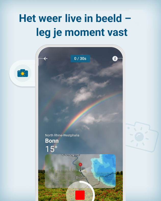 Deel je moment – ​​de nieuwe functie van de Weer & Radar app.Deel je moment – ​​de nieuwe functie van de Weer & Radar app.