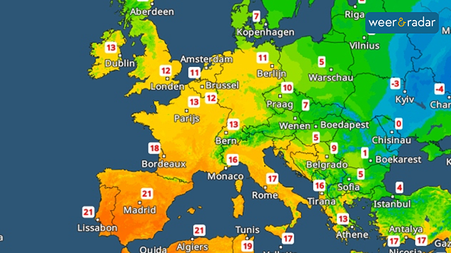 Op zaterdag kan het in Zuid-Frankrijk tot Zuid-Spanje tot 20 graden worden, in Andalusië wordt het op zondag plaatselijk zelfs 25 graden. In West- en Midden-Europa wordt het 10 tot 17 graden.