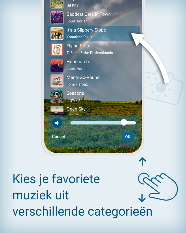 De app voegt automatisch je locatie, de temperatuur en zelfs de actuele WeerRadar toe. Je kunt muziek of filters kiezen die bij je stemming passen.
