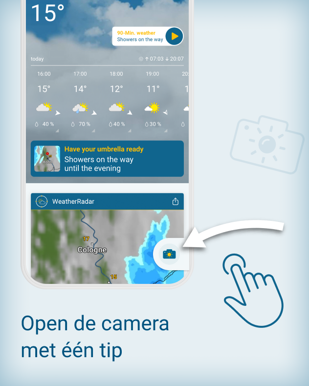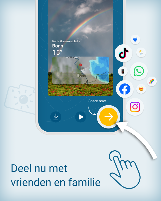 Gedeelde vreugde is dubbele vreugde. Dat geldt ook voor de vreugde van het delen van bijzondere momenten. Daarom heeft de Weer & Radar app een functie die speciaal hiervoor is ontworpen: kijken, bewonderen, vastleggen en anderen inspireren.