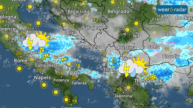 Vandaag (dinsdag) trekt het gebied met hevige buien en onweersbuien verder naar Zuid- en Midden-Italië. Ook Albanië en Bulgarije worden getroffen. Het risico op noodweer is niet bijzonder groot. Toch kunnen er hier en daar verrassingen optreden.
