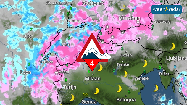 De WeerRadar laat zien dat er flink sneeuwt in de Alpen, wat voor een groot lawinegevaar zorgt.