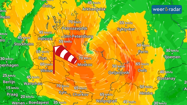 De WindRadar toonde een uitgestrekt stormgebied rondom het centrum van het lagedrukgebied ten noordoosten van Moskou.