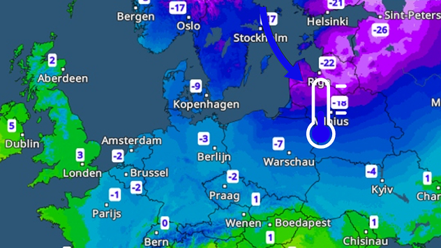 De TemperatuurRadar toont vorst in vrijwel heel Nederland met 0 tot -5 graden. Een blauwe thermometer staat ingetekend.In de nacht naar zaterdag en vooral de nacht naar zondag vriest het op veel plaatsen.