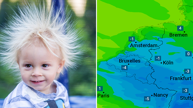 Kaart van Europa met een temperatuurradar in het westen en een weerradar in het noorden. Milde tot warme temperaturen boven het Iberisch schiereiland. Sneeuw en kou in Scandinavië zijn duidelijk te zien.