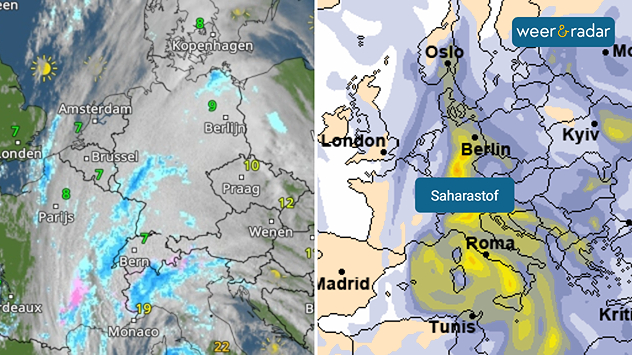 Op de WeerRadar is een opvallende structuur in het wolkendek boven Europa te zien. Dit hangt samen met hoge concentraties Saharastof in de lucht.