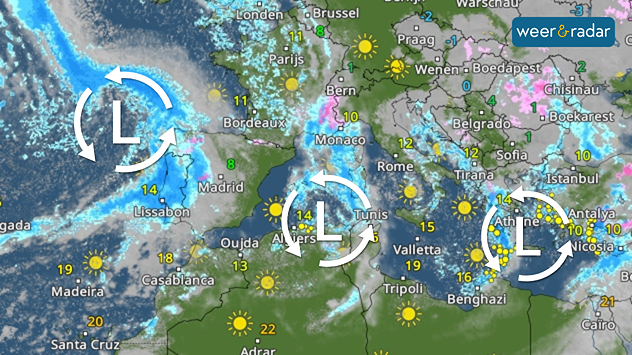 WeerRadar: Rondom de Middellandse Zee zijn meerdere lagedrukgebieden actief.