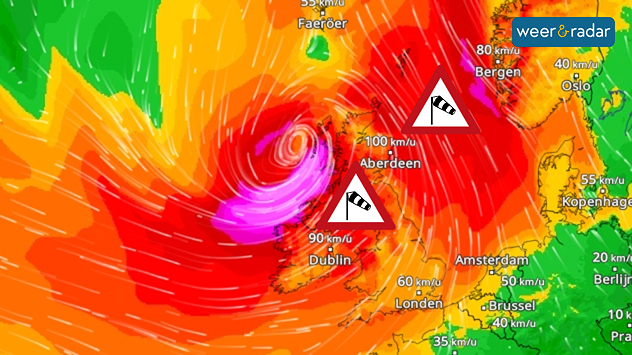 Vanaf vrijdag dreigen er aan de Ierse kust en in Schotland stormachtige windstoten met snelheden van 120 kilometer per uur en meer. Daar komen nog hevige regenbuien bij.