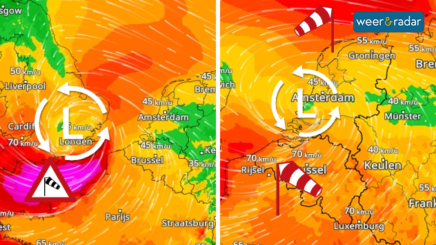 WindRadar: Op donderdagavond (links) dreigt er storm boven het Kanaal, op vrijdag (rechts) waait het in grote delen van de Benelux hard.