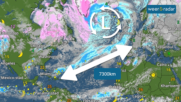 Een bijzonder lang weerfront strekt zich uit van de Faeröereilanden in de Noord-Atlantische Oceaan tot aan Florida. Het scheidt koude pool lucht van warmere lucht verder naar het zuiden. Aan het weerfront valt er hevige regen en richting Amerika zijn er ook onweersbuien.