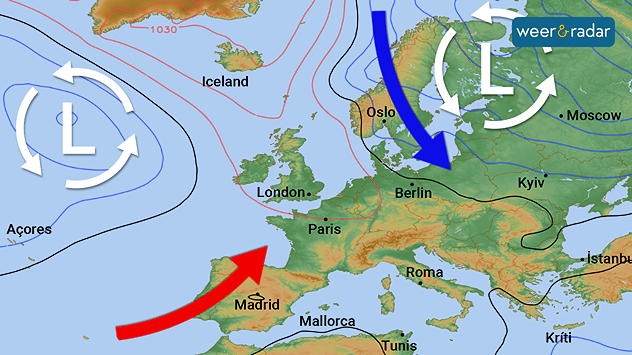 Een lagedrukgebied boven Noordwest-Rusland stuurt koude lucht naar het zuiden. Een ander lagedrukgebied boven de Atlantische Oceaan voert warme lucht aan.