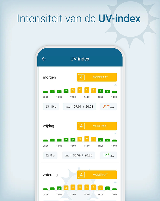 De UV-index is in de komende dagen overdag moderaat. Wist je dat je veel informatie hierover kunt vinden in de Weer&Radar app?