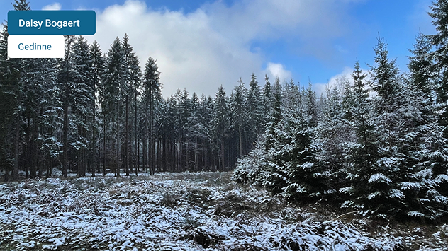Besneeuwd bos met besneeuwde bomen en pad onder een grijze hemel.