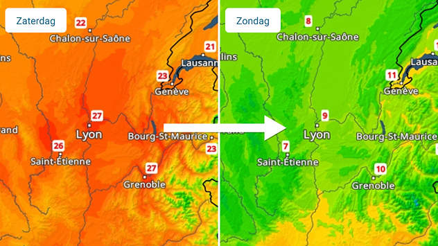 Op de TemperatuurRadar is de opvallende ommekeer duidelijk te zien. Rond Lyon wordt het zo’n 20 graden koeler.