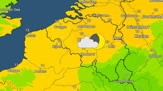 Zondag begint met veel zonneschijn, alleen in de Ardennen hangt vaak ochtendgrijs. In de loop van de dag verschijnen er overal steeds meer wolken en 's avonds volgt er een gebied met regen. De eerst nog zwakke zuidwestenwind neemt 's middags echter al in kracht toe. Het wordt een graad of 10, in de Ardennen maximaal 5 graden.
