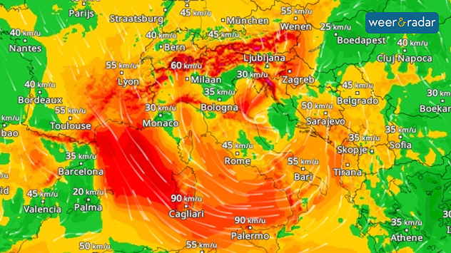 Het is stormachtig in het Middellandse Zeegebied. Een sterk lagedrukgebied zorgt vooral vanaf de Franse kust via Menorca tot aan Sardinië voor rukwinden van meer dan 100 kilometer per uur. Daar bereiken de golven op zee een hoogte van wel 6 meter.
