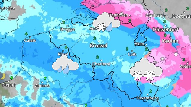In de nacht valt er sneeuw. Het is zwaar bewolkt. De temperatuur ligt in de komende uren rond de -2 graden. Vandaag sneeuwt het en het is zwaar bewolkt. Er is kans op zware windstoten. De temperaturen bereiken maxima rond de 1 graad.